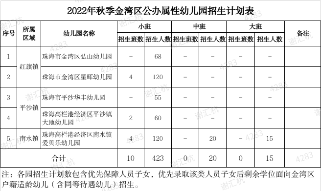 珠海金湾区2022年秋季公办幼儿园招生计划