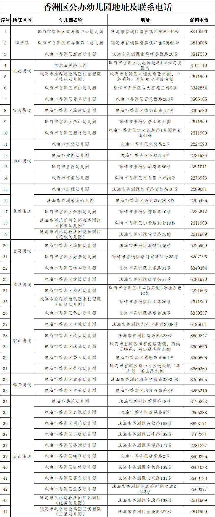区教育局幼儿园招生咨询电话:0756-2611909(工作日9:00-12:00,14:00-18:00)。