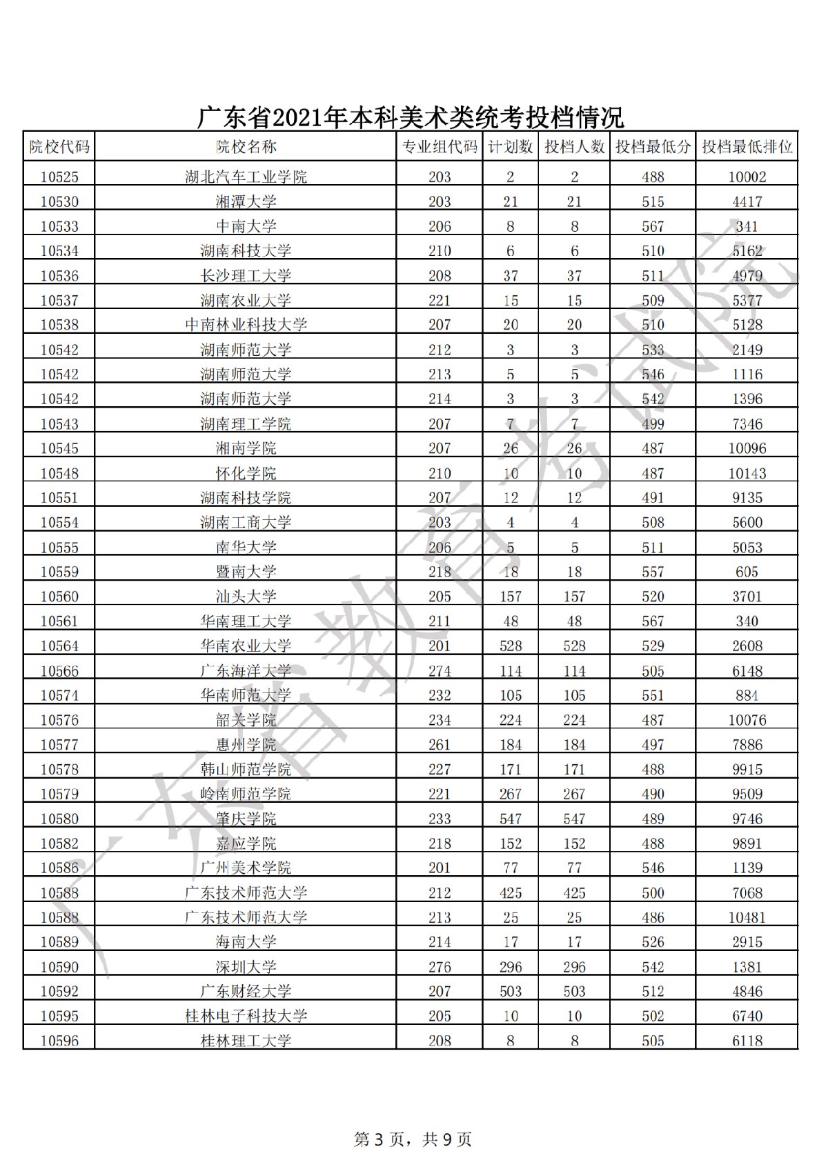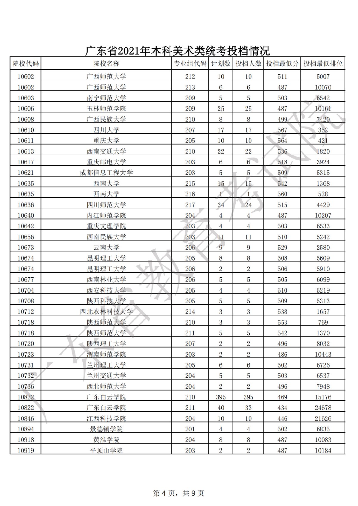 2021年7月21日广东省普通高考本科各类批次录取投档情况公布,以下是美术类统考投档情况,包含投档人数、投档最低分及投档最低排位等相关信息。