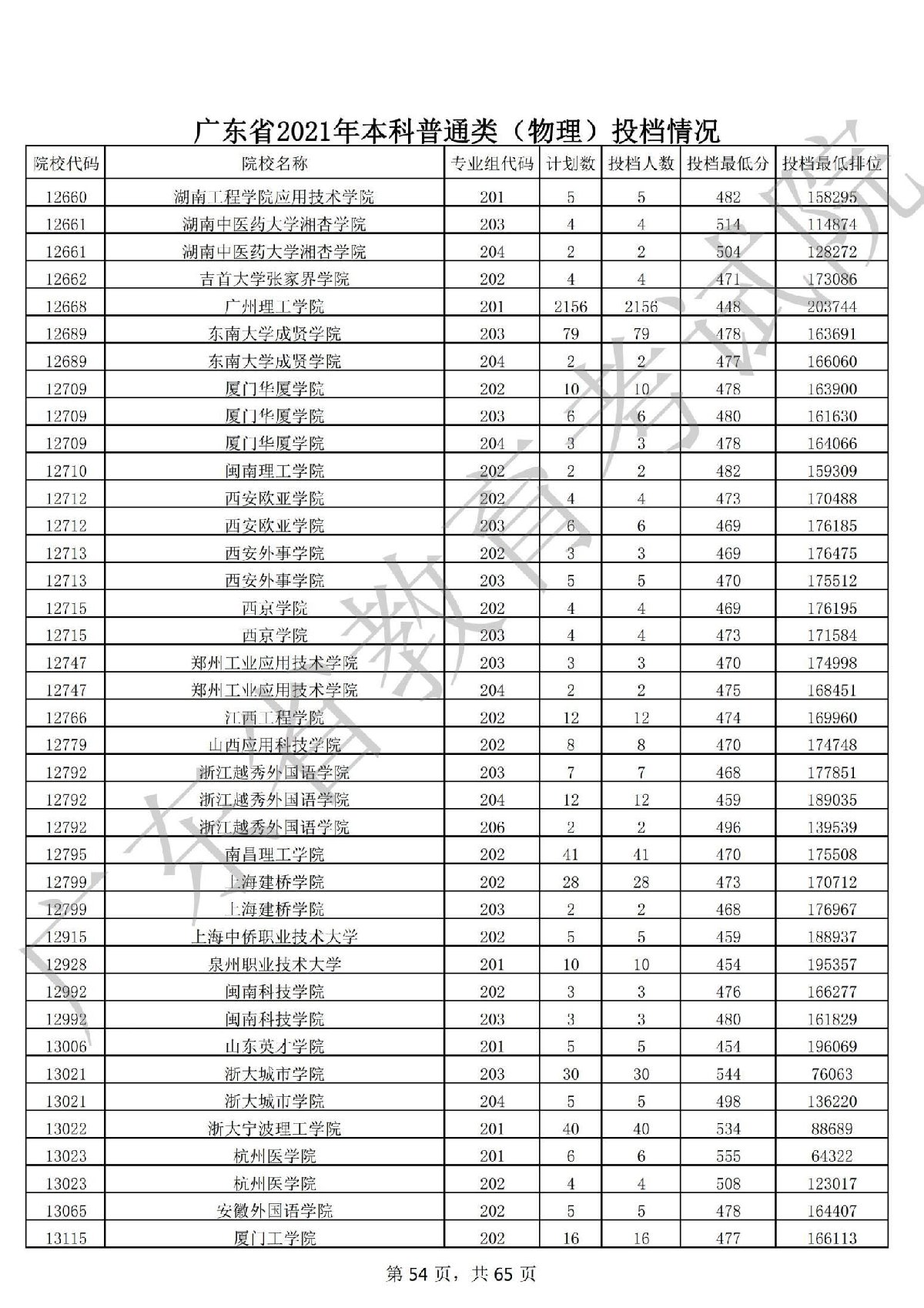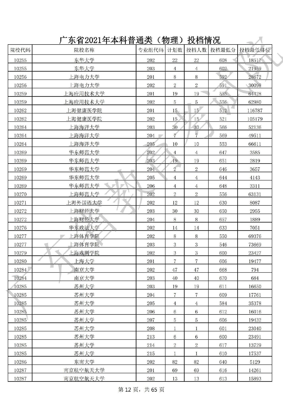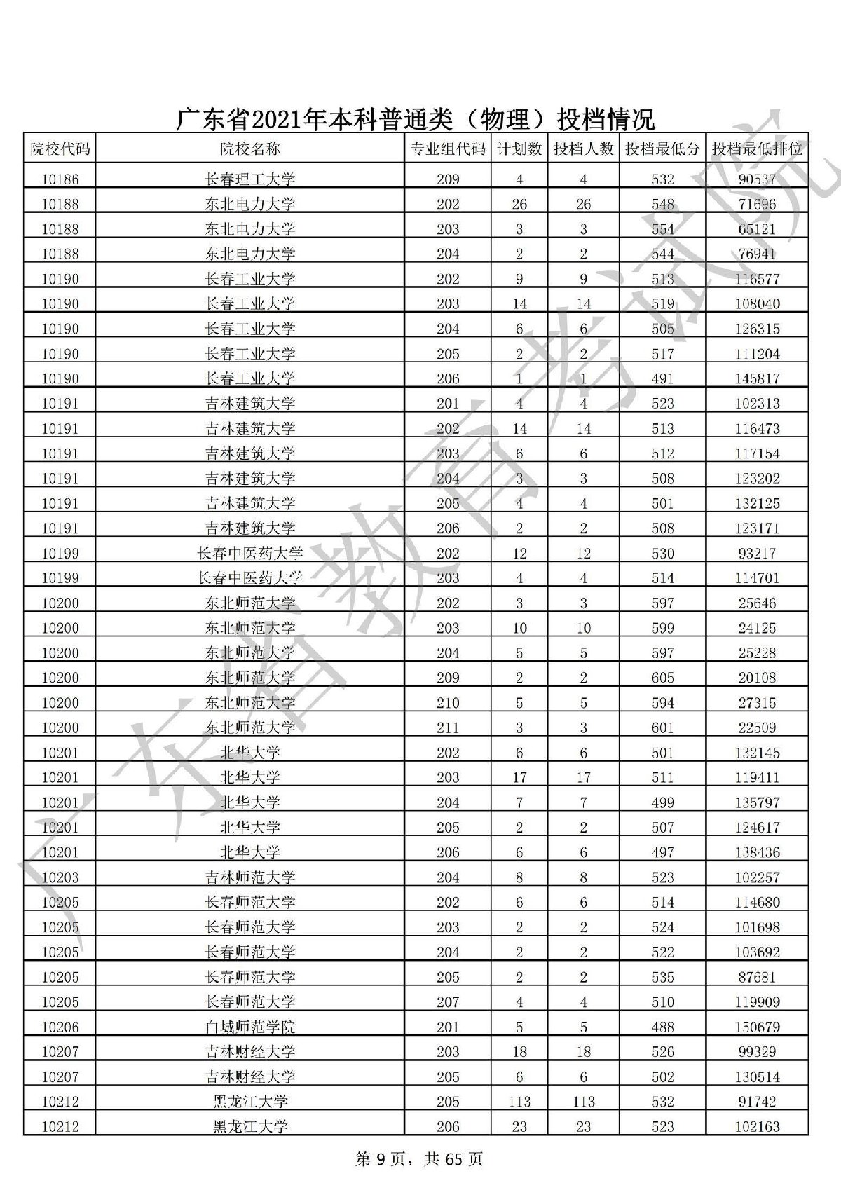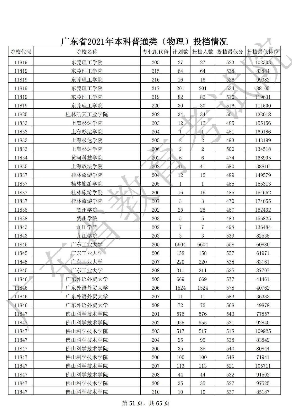 广东省2021年本科普通类(物理)投档情况