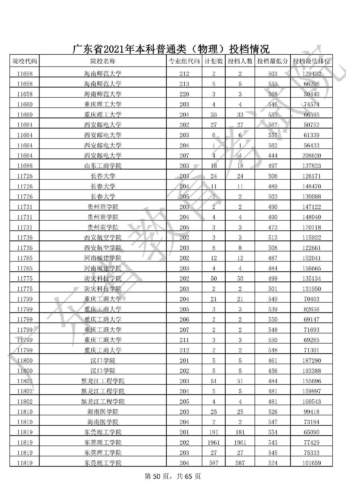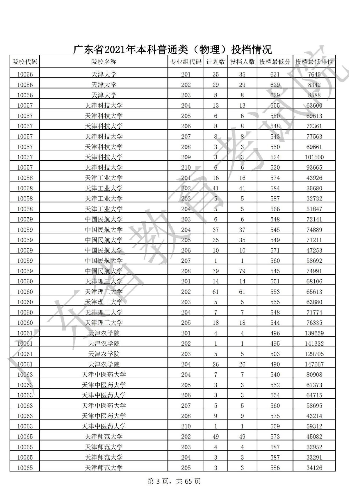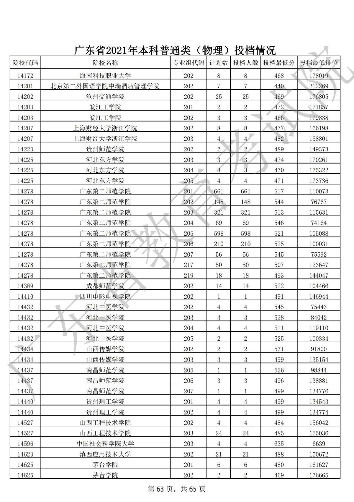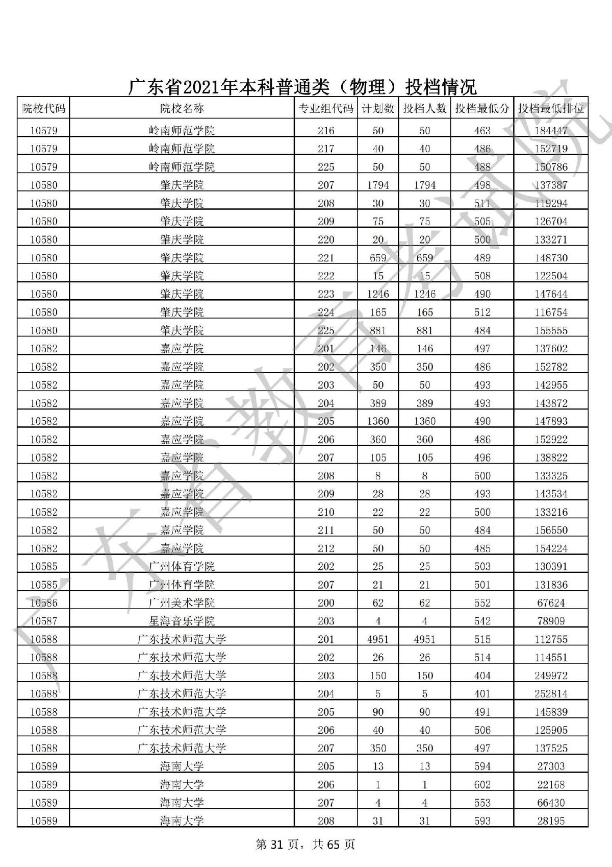 广东省2021年本科普通类(物理)投档情况