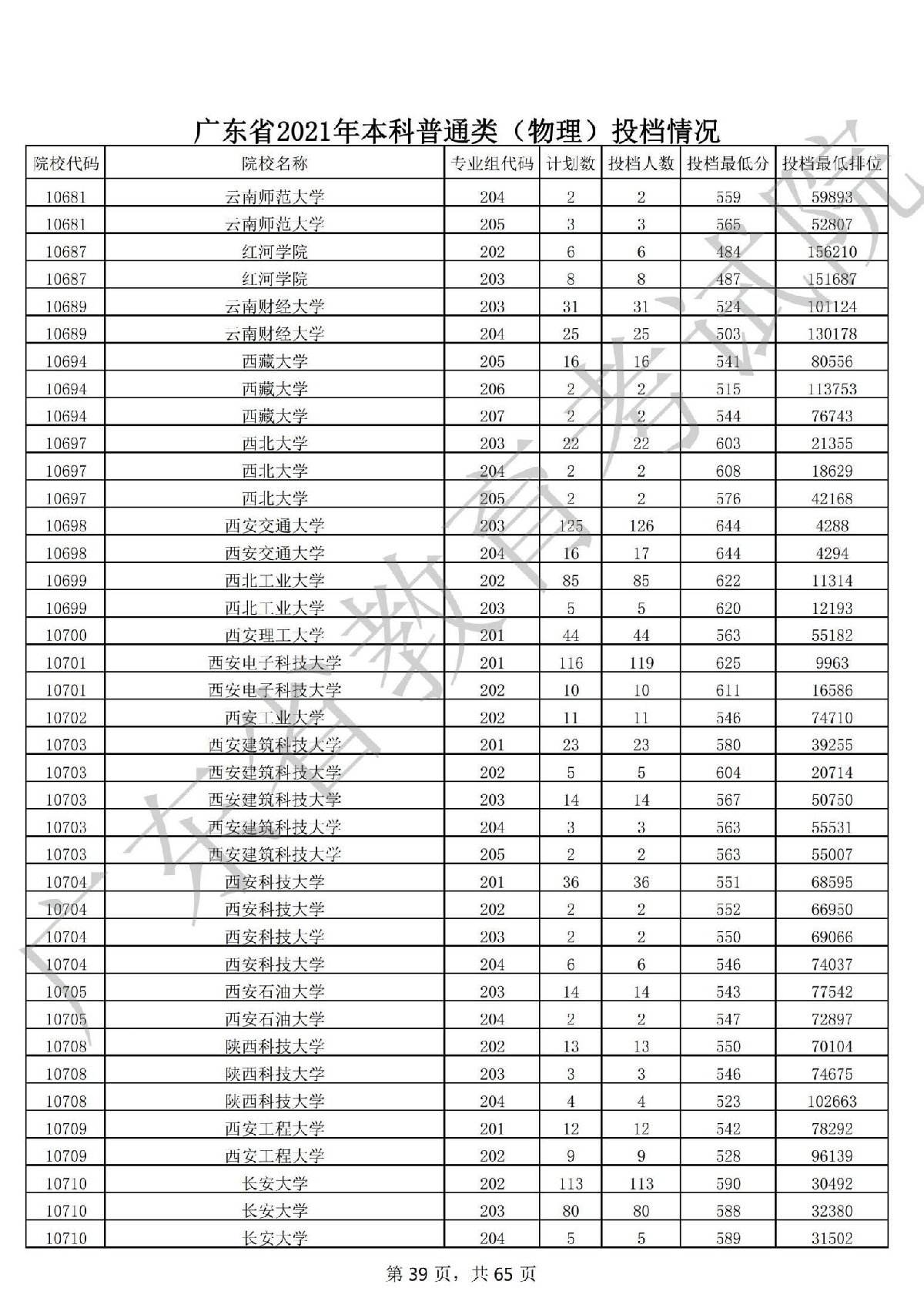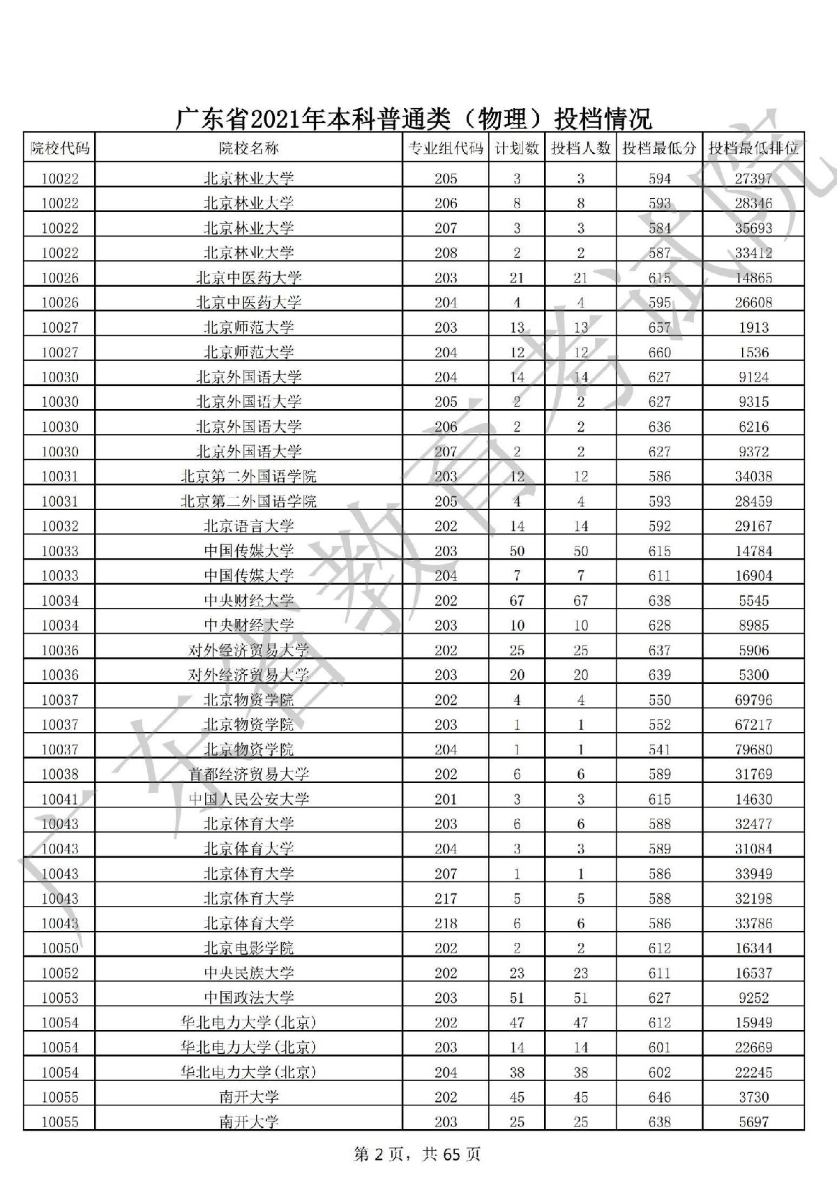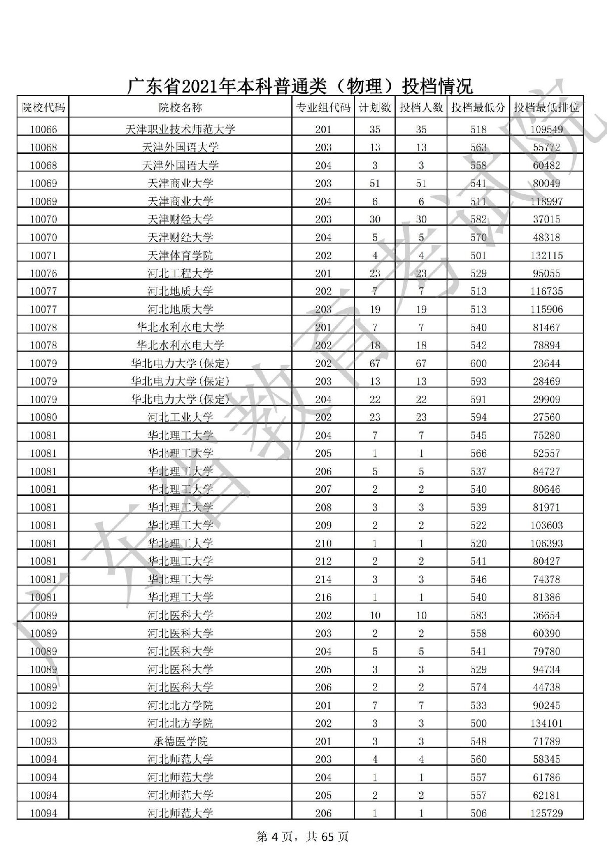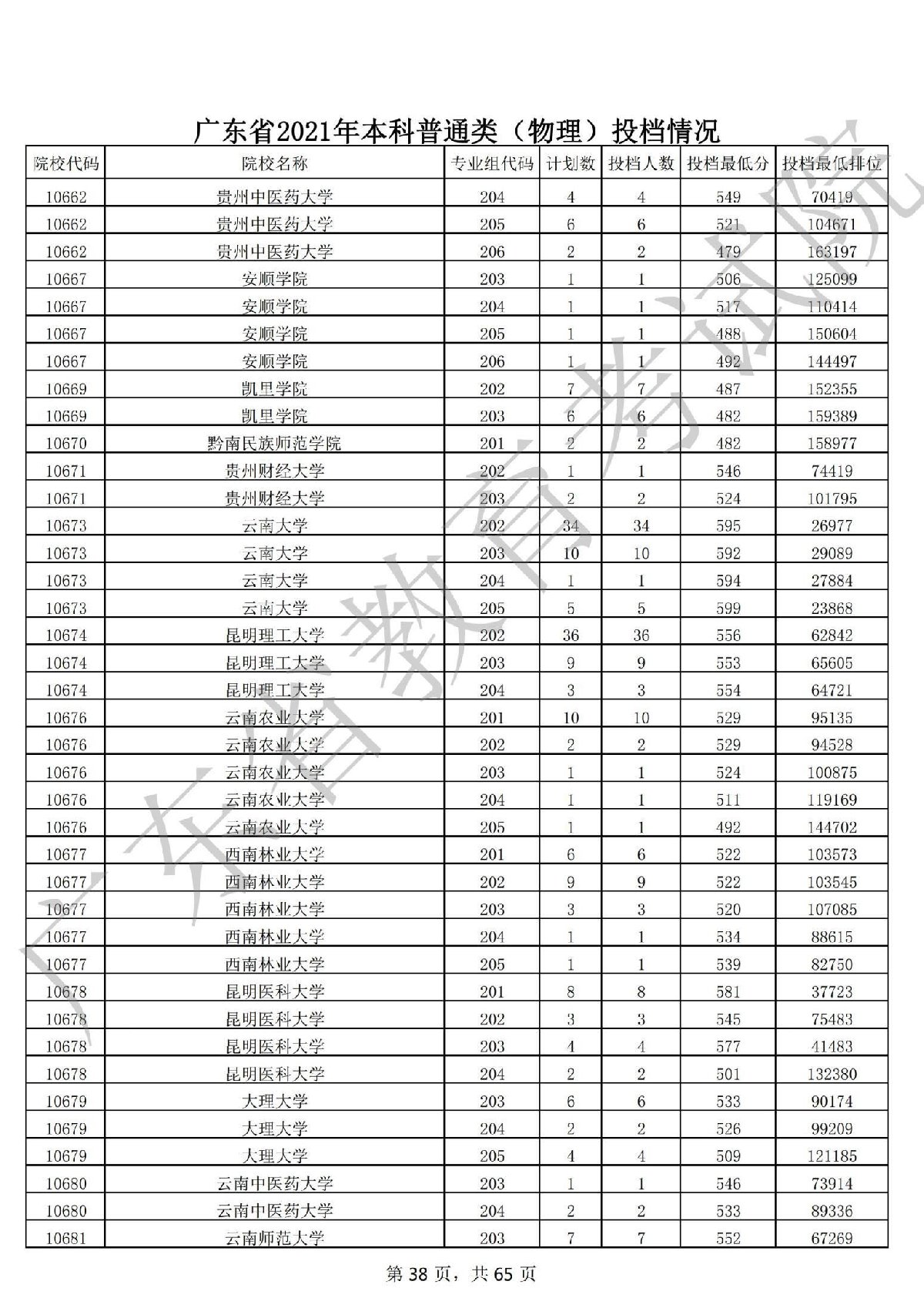 广东省2021年本科普通类(物理)投档情况