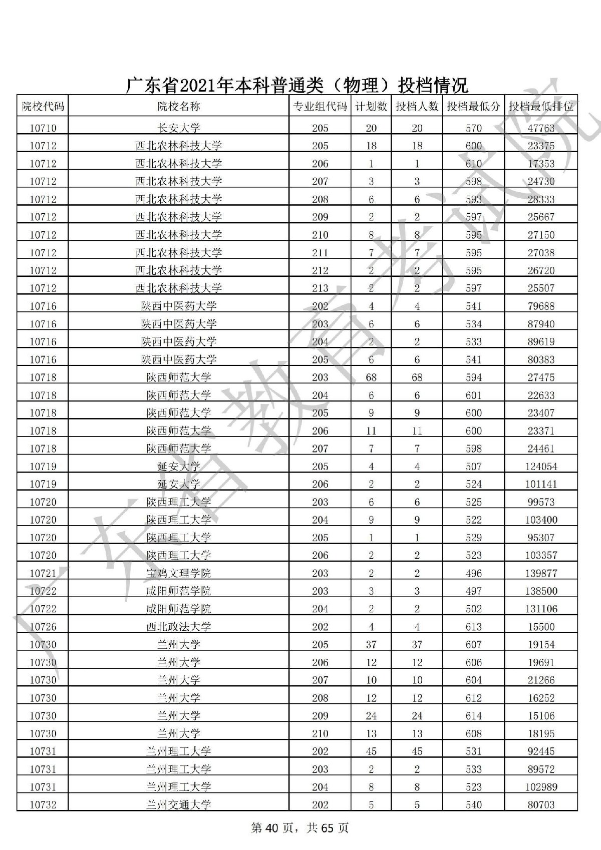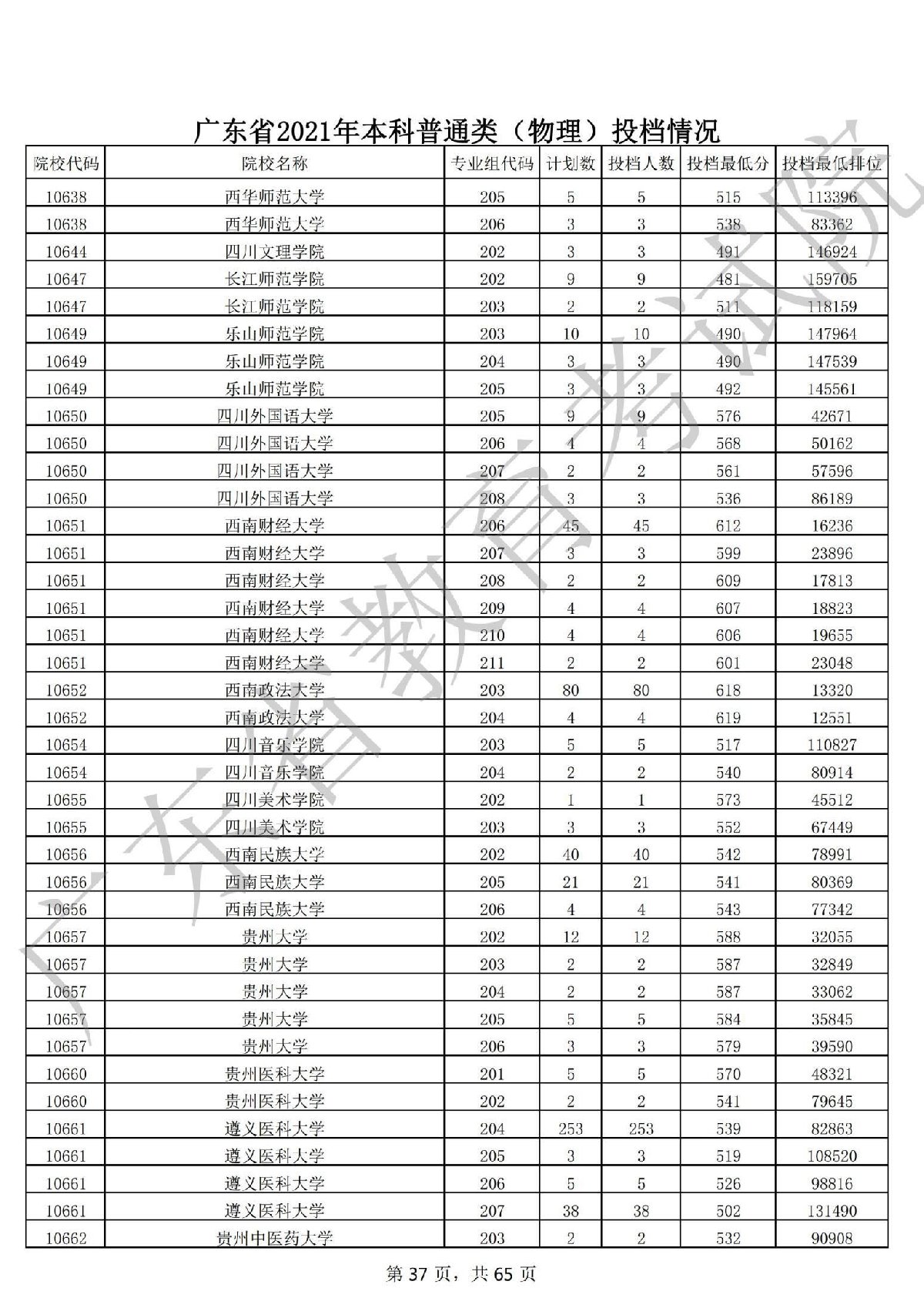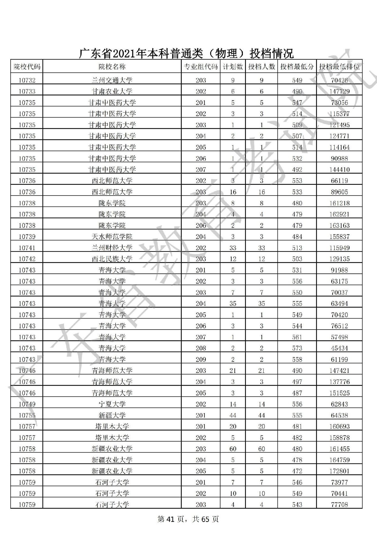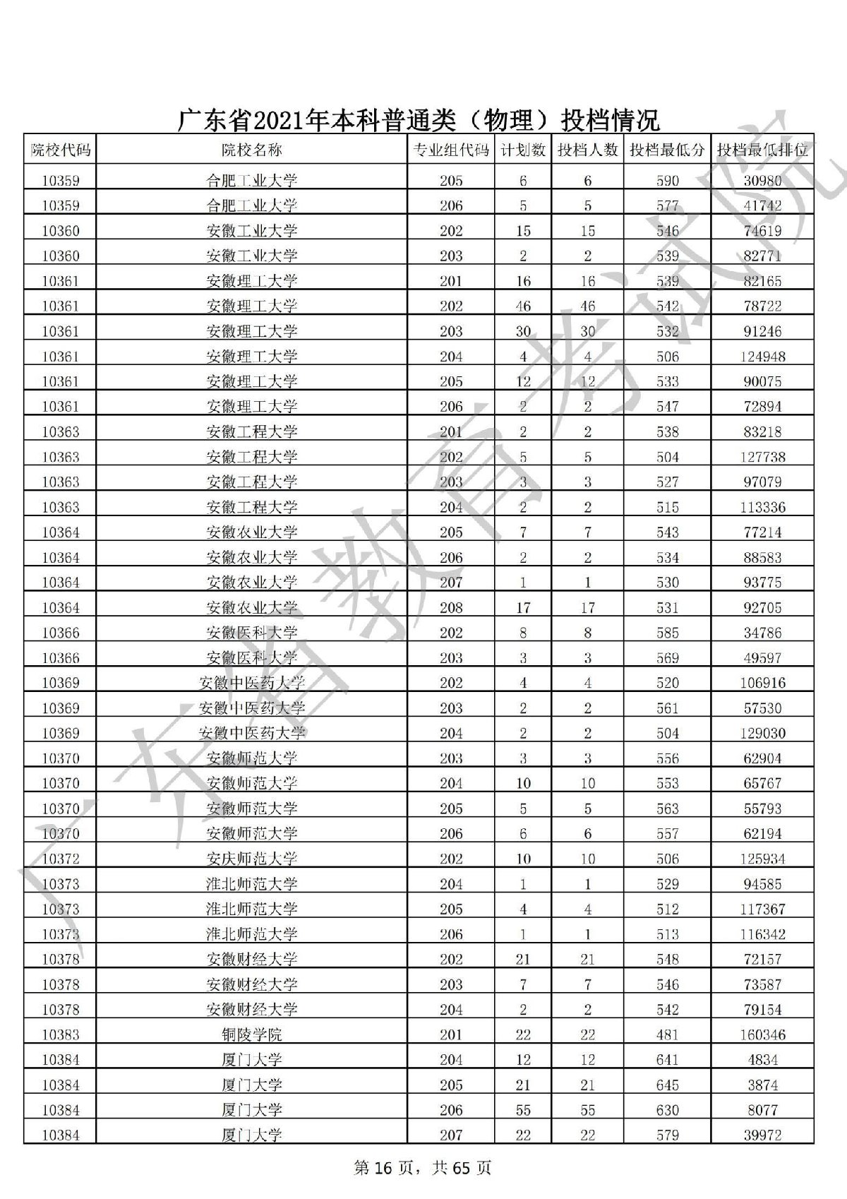 广东省2021年本科普通类(物理)投档情况