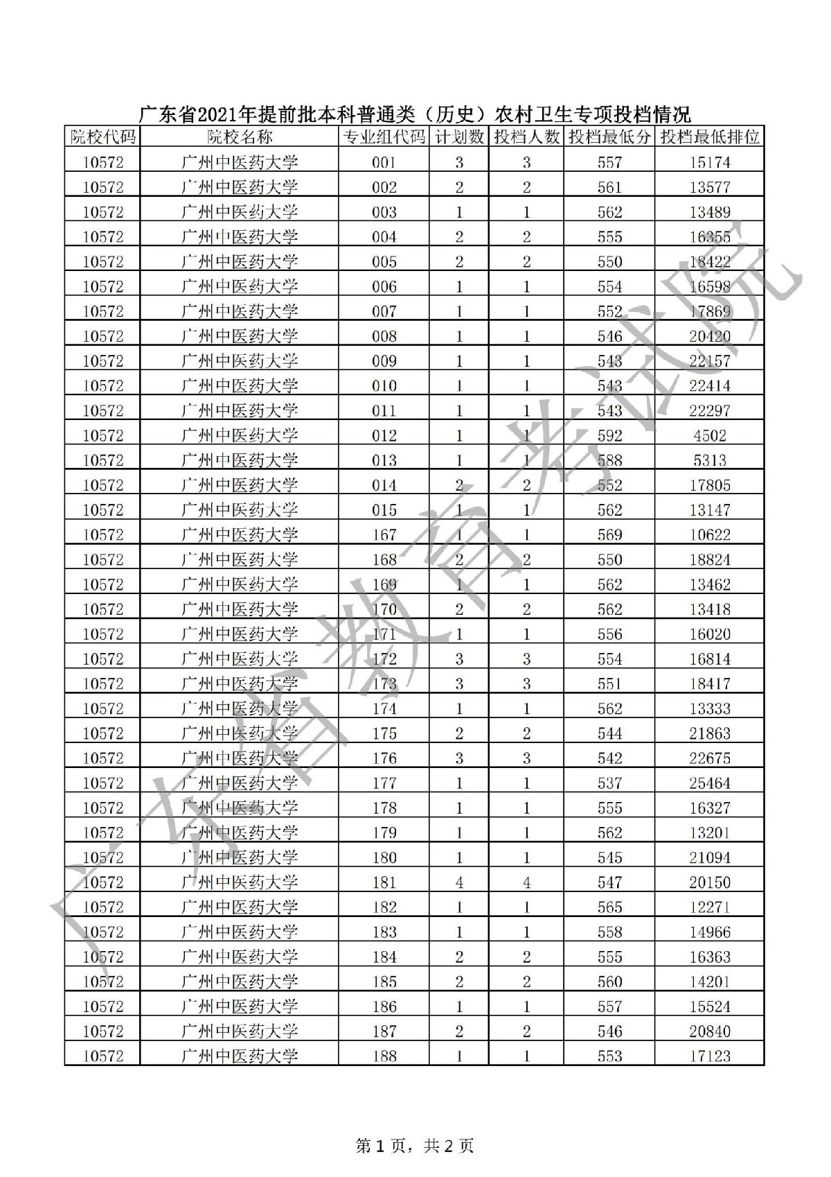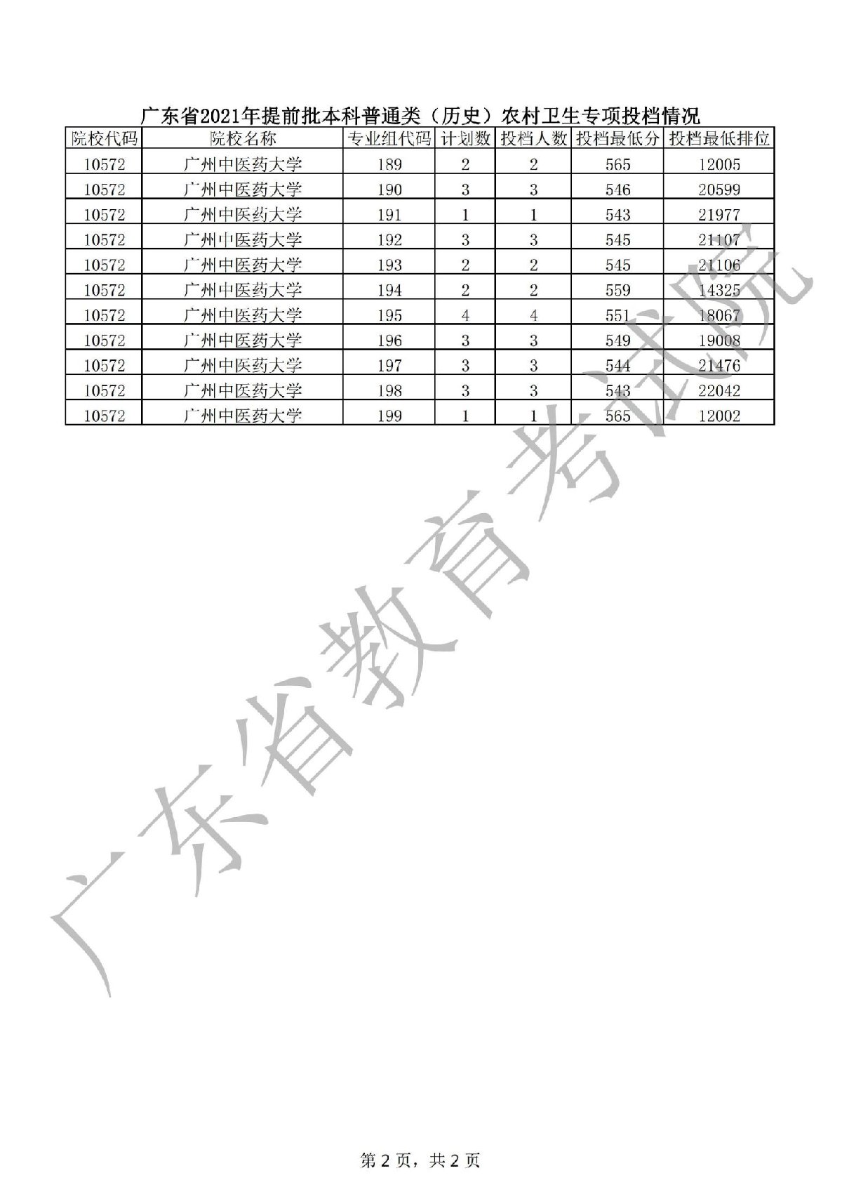 广东省2021年提前批本科普通类(历史)农村卫生专项投档情况