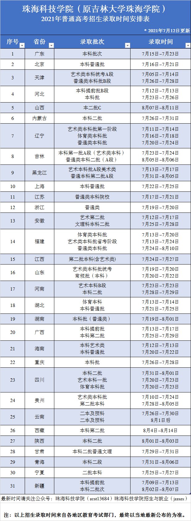 珠海科技学院(原吉林大学珠海学院)2021年普通高考招生录取时间安排