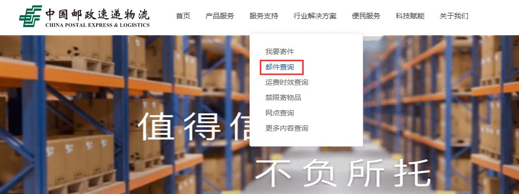 点击进入中国邮政速递物流官网后,在首页点击导航栏【服务支持】,选择【邮件查询】