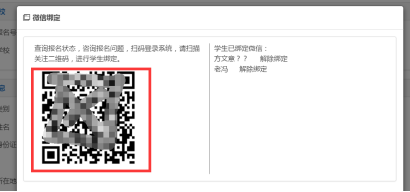 家长报名成功后会弹出二维码,家长用微信扫描后进入公众号,手机报名的,长按二维码进入公众号进行关注绑定。