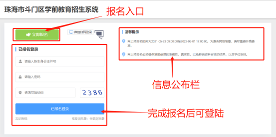 左上方显示家长所在斗门区报名端口所属的系统;右侧为公告栏