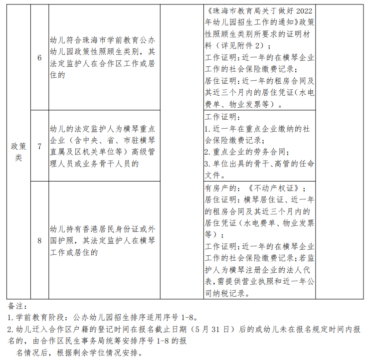 | 小班 | 须为2022年8月31日前满三周岁(即2018年9月1日至2019年8月31日出生)的适龄幼儿 | 横琴中心幼儿园、首都师范大学横琴子期实验幼儿园 预登记:荔枝湾小区配套幼儿园(暂定名) | 1.具有横琴户籍或持有澳门居民身份证的适龄幼儿(详见附件1第1-5项) 2.符合珠海市和合作区规定的政策性照顾类适龄幼儿(详见附件1第6-8项) |