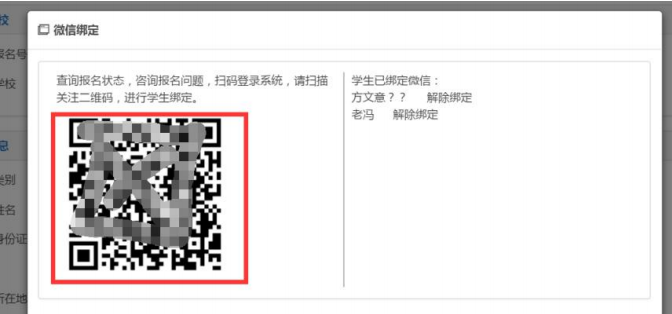 报名后会生成二维码,手机微信扫描二维码,进入公众号,家长通过公众号绑定学生信息后,可直接在公众号里登录招生系统,之后就不需要再输入账号密码。(其余绑定方式请参考下文登录)