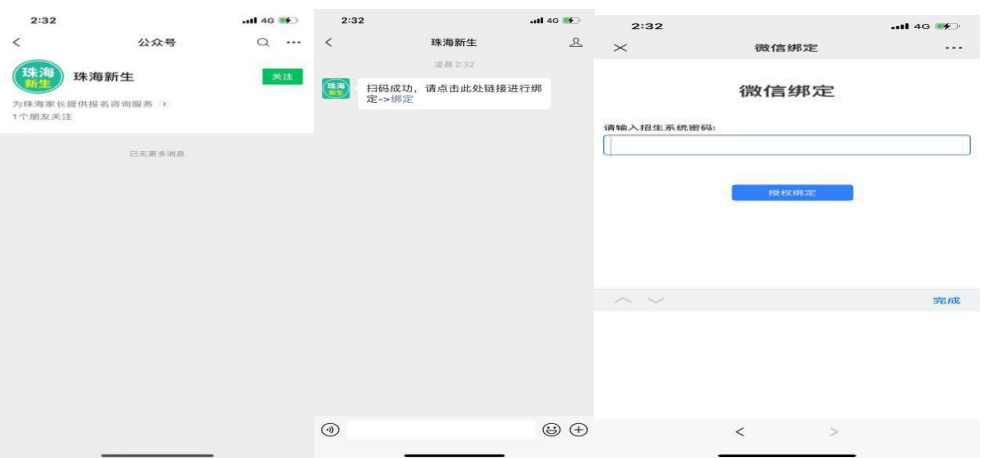 2.进入公众号,点击绑定,输入报名密码验证即可绑定。
