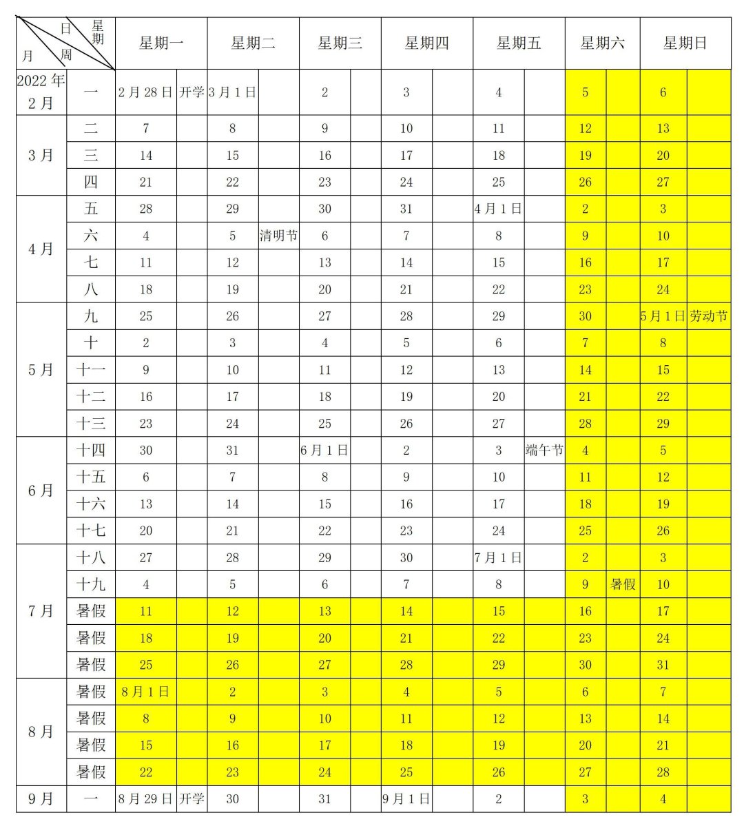2022年2月28日开学,7月9日放假,共19周。其中课堂教学16周,实践教学2周,期末考试1周。