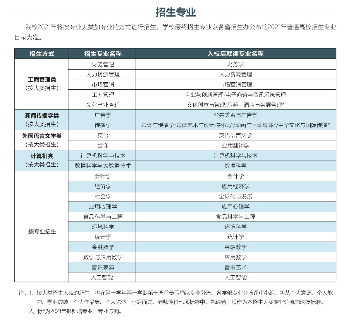 注:人工智能为2021年我校拟新增专业。2021年各省市区招生专业及计划以各省市招办公布的招生专业目录为准。