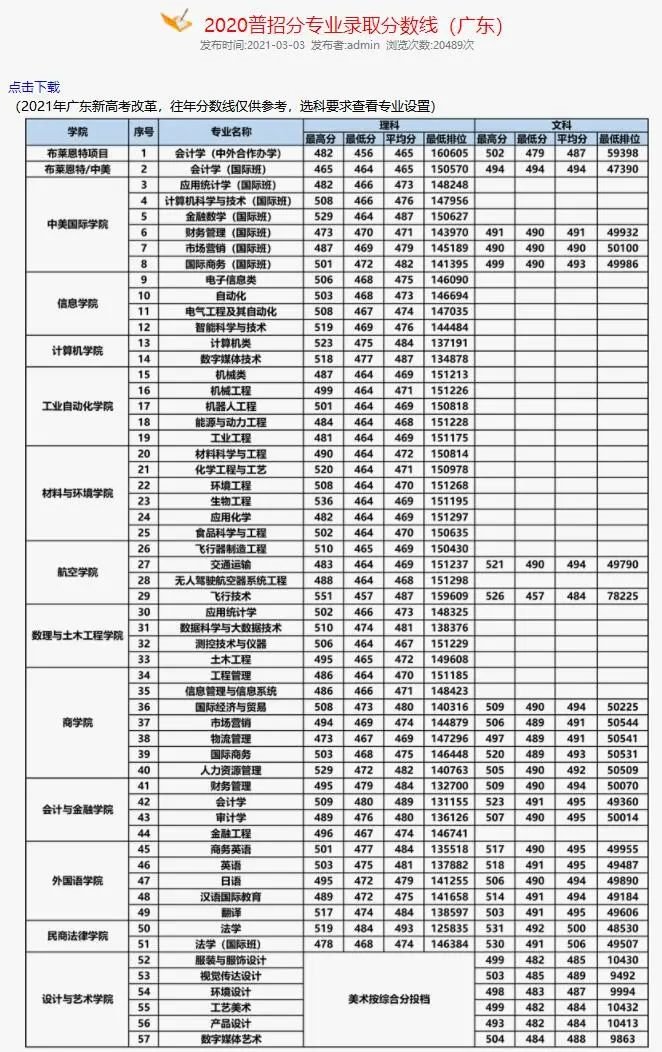 2020年北理珠2020普招分专业录取分数线(广东)