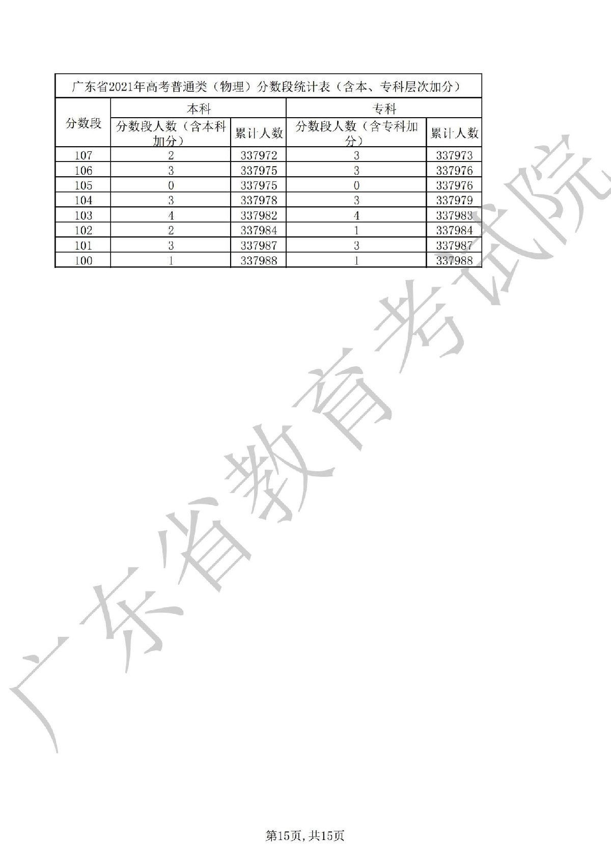 广东省2021年高考普通类(物理)分数段统计表