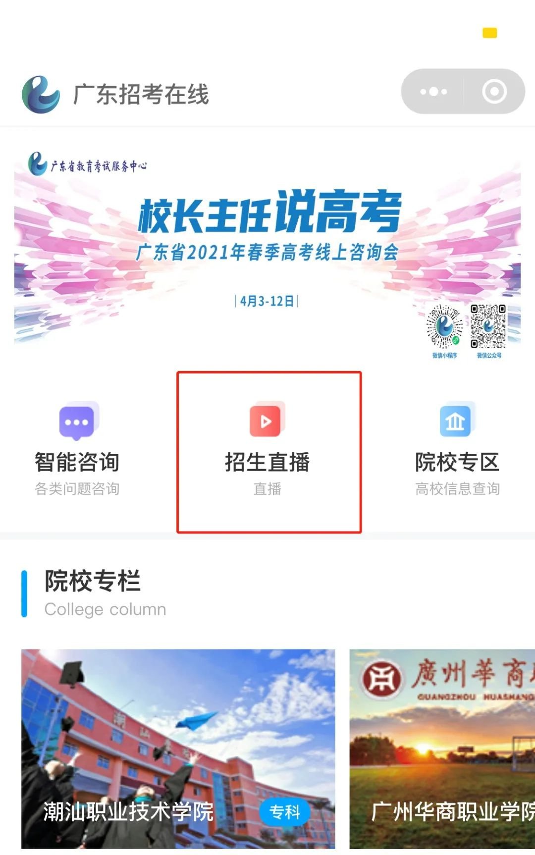 第一步:按小程序码即可快速进入“广东招考在线”小程序首页;