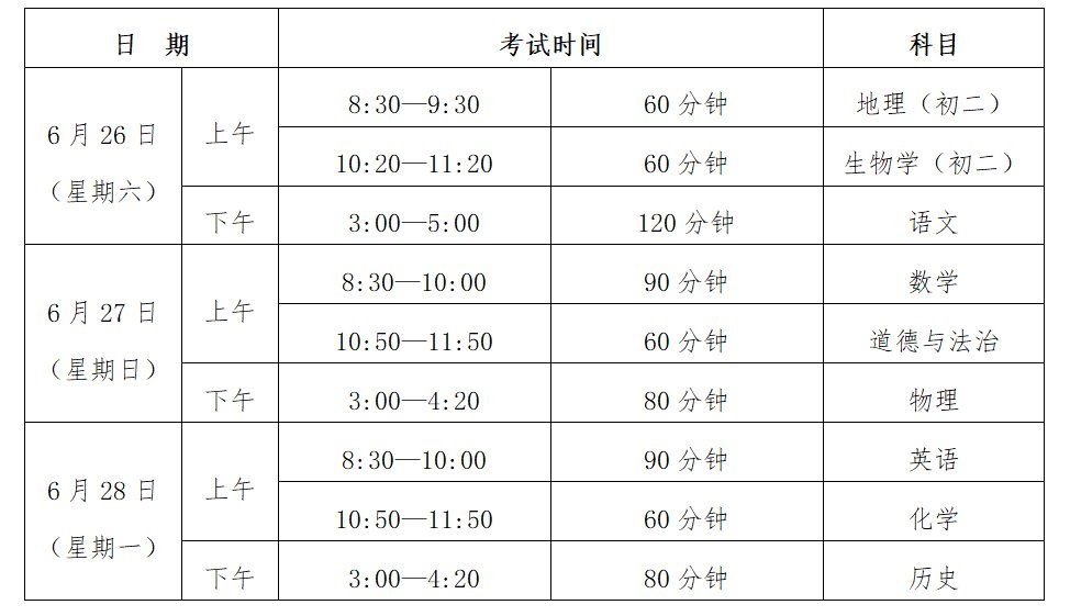 我市初中学业水平考试时间已经发布,具体时间如下表: