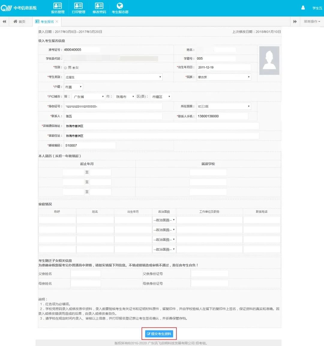 填写个人报名信息,红色 * 标识的为必填项,若为随迁子女,必须填写“考生随迁女子相关信息” (父母双方姓名和身份证号)。