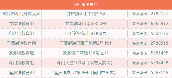 另外,斗门区教育局于2022年6月10日至8月31日在斗门区开放大学(原斗门区广播电视大学)设立招生服务窗口,同时在各镇(街道)教育组、各学校内设立招生服务窗口,负责咨询、报名等相关工作。地点、联系方式如下: