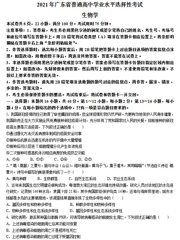 2021广东高考生物真题及答案 2021广东高考生物真题及答案完整版