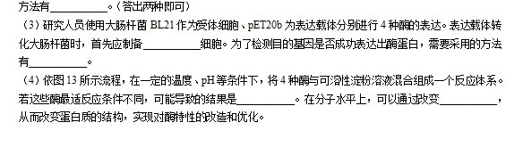 (3)研究人员使用大肠杆菌BL21作为受体细胞、pET20b为表达载体分别进行4种酶的表达。表达载体转化大肠杆菌时,首先应制备感受态细胞, 即利用钙离子处理大肠杆菌,使其成为感受态细胞,使其 易于接受外来的DNA分子。基因工程中,酶基因(目的基因)成功表达的产物酶蛋白的化学本质是蛋白质,常用抗原-抗体杂交技术进行检测。