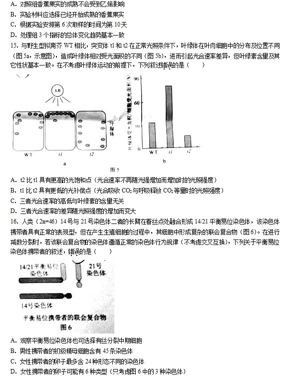 D女性携带者的卵子可能有6种类型(只考虑图6中的3种染色体)分别是:①含有14、21号染色体的正常卵细胞、②含有14/21平衡易位染色体的卵细胞、③含有14/21平衡易位染色体和21号染色体的卵细胞、④含有14号染色体的卵细胞、⑤14/21平衡易位染色体和14号染色体的卵细胞、⑥含有21号染色体的卵细胞,D正确。