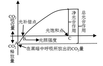 A表示植物呼吸作用强度,A点植物不进行光合作用,B点表示光补偿点,C点表示光饱和点。