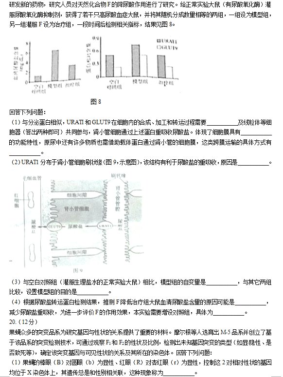 【详解】(1)分泌蛋白在细胞内的合成、加工和转运过程需要核糖体、内质网、高尔基体及线粒体等细胞器共同参与,由于URAT1和GLUT9与分泌蛋白相似,因此URAT1和GLUT9在细胞内的合成、加工和转运过程需要核糖体、内质网、高尔基体及线粒体等细胞器共同参与。肾小管细胞通过URAT1和GLUT9蛋白重吸收尿酸盐,体现了细胞膜的选择透过性。借助载体蛋白的跨膜运输的方式有协助扩散和主动运输。