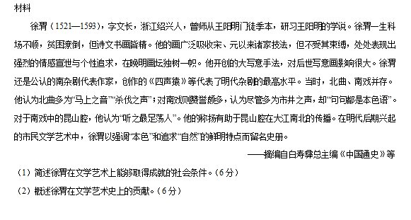 【详解】(1)根据其所处的时代可得出明代社会稳定,商品经济的发展;根据“曾师从王阳明门徒季本,研习王阳明的学说”得出理学的不断发展;根据“他的画广泛吸收宋、元以来诸家技法,但不受其束缚,处处表现出强烈的情感宣泄与个性追求”得出传统绘画技术的发展;根据“徐渭还是公认的南杂剧代表作家,创作的《四声猿》等代表了明代杂剧的最高水平”可从古代戏曲的发展与成熟的角度概括;根据“在明代后期兴起的市民文学艺术中”可得出市民阶层的发展壮大;