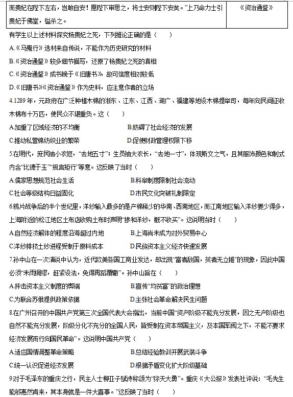 【详解】 洋纱(英国纱为主)所使用的原料“棉花”,多进口于印度、美国,经过长途贩运,原料成本较高,而江南地区就地取材,“土纱”虽然没有机器生产的优势,但得益于“地利”,对洋纱形成优势,C正确;材料显示,自然经济解体的程度在内地的某些地区并不输于沿海,A排除;材料没有反映“上海尚未成为对外贸易中心”,所以B错误;材料没有涉及民族资本主义经济,D排除。