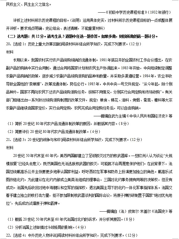 20、(1)原因:统购统销的流通体制的弊端;计划经济体制的束缚;改革开放的推行;农村经济体制改革的开展;农业的丰产;内容:将国家计划和农民生产相结合;减少农副产品统购派购;开展多渠道经营;家产品实行合同定购。