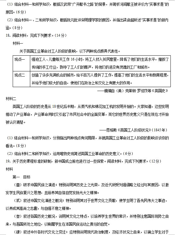 18、(1)局限:观点一放大了工业革命的局限性,忽视了工业革命的进步性;观点二忽视了工业革命的局限性,放大了工业革命的进步性。看法:工业革命的进步性主要体现在促进城市化,提高民众的教育水平和生活水平,推动了政治民主化,其主要的局限性体现在加剧了贫富分化。