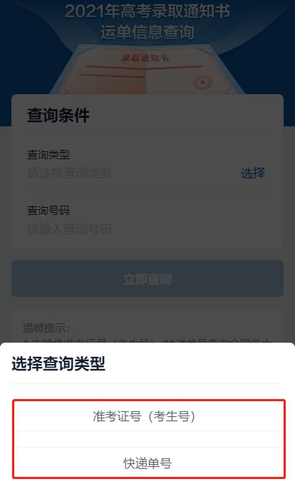 考生点击进入查询系统后,凭准考证号(考生号)或录取通知书快递单号查询,及时掌握录取通知书发放时间、投递时间及寄达时间。