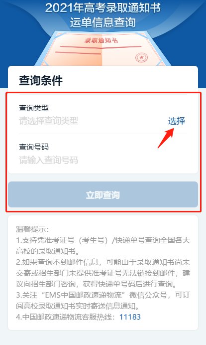 第二步:选择【查询类型】:准考证号(考生号)或快递单号