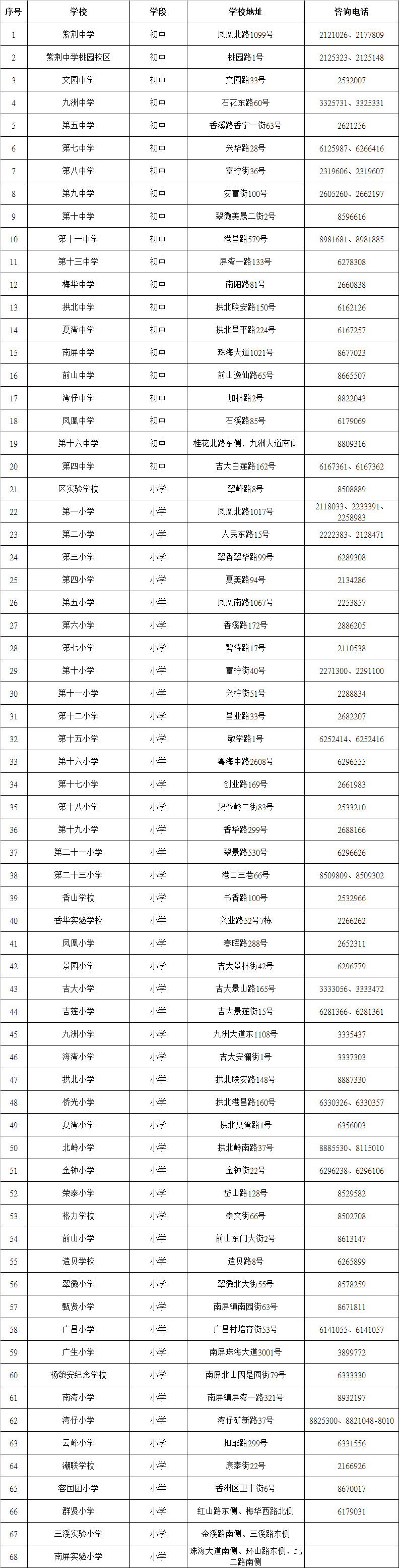 2022年秋季香洲区公办中小学招生咨询电话一览表