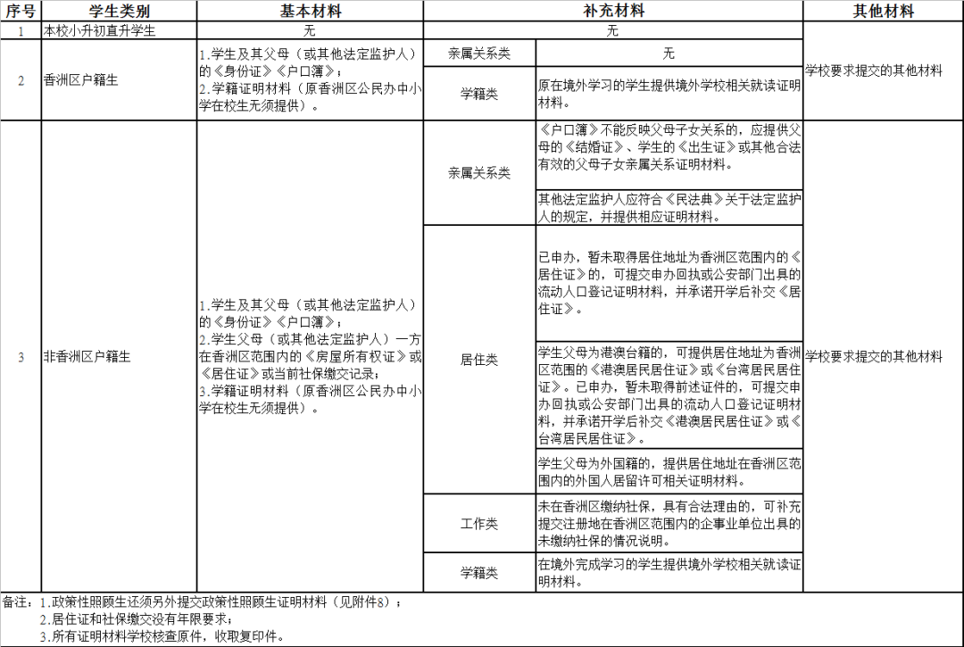 (三)非香洲区户籍学生提交材料(5月8日-31日)。 非香洲区户籍生应当在报名结束前向拟报读学校提交相关入学材料(见附件9)。符合民办中小学政策性照顾生条件的,还应当向拟报读学校提交政策性照顾生证明材料(见附件8)。