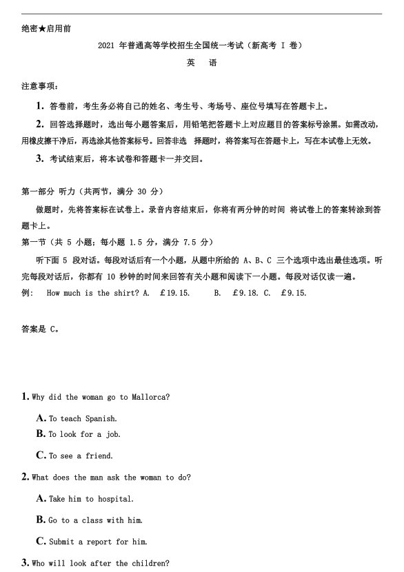 2021广东高考英语试题及答案 2021广东高考英语试题及答案解析