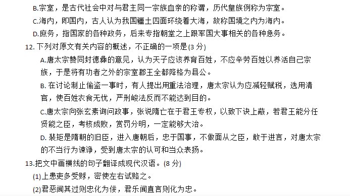 12.B【解析】本题考查原文理解,B项中“严刑峻法反而不能达到目的”有误,原文只说“安用重法邪”,用不着重法,并没有说严刑达不到目的。