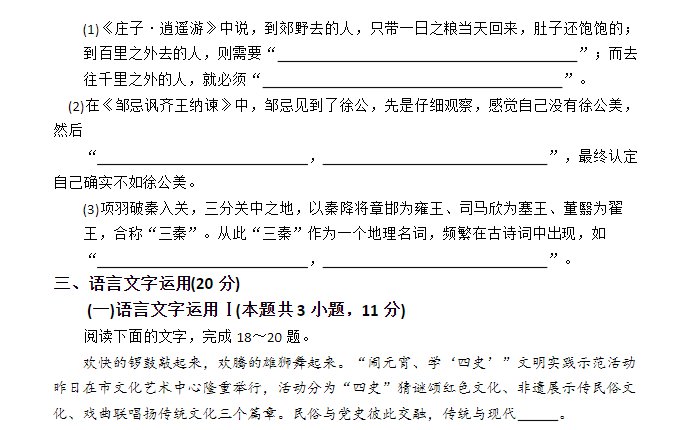 【解析】默写第一题和第二题没有难度,根据题目中篇目和语意的提示即可,注意“舂”和“窥”字的书写;第二题注意“然后”的提示语;第三题聚焦古诗词中的地理名词,填出含有规定的关键字“三秦”的诗句,考查考生的诗词储备。