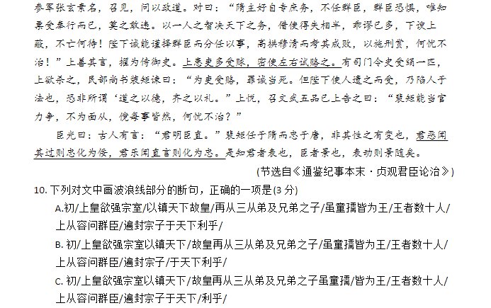 10.B【解析】本题考查文言文断句,通过文言文中断句的常见标志和文意进行断句,“强宗室”和“以镇天下”是完整意思,不可断开,可首先排除A和D,再通过“于天下利乎”判断为B。这句话的意思是:起初,唐高祖想通过加强皇室宗族来镇服天下,所以与皇帝同曾祖、同高祖的远房堂兄弟以及他们的儿子,即使是童孺幼子也都封为王爵,前后封王之人达数十个。唐太宗继位后,问群臣道:“遍封皇族子弟为王,对天下有利吗?