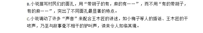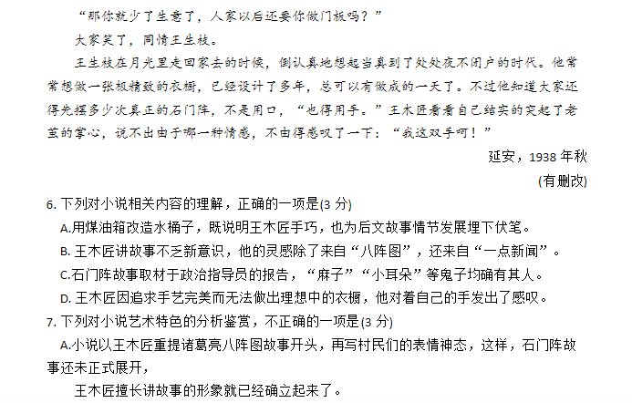 6.B【解析】A为后文故事情节发展埋下伏笔,在后文未见照应。C麻子,小耳朵并非确有其人,是王木匠根据现场听众的样子杜撰的。D王木匠能做出精致的衣橱,是因为战乱才不能做。