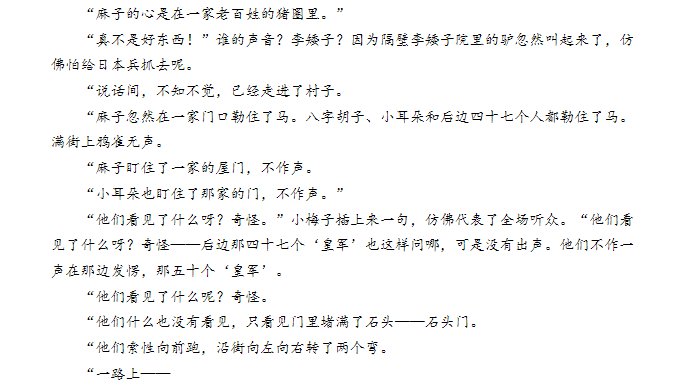 【解析】此题考查小说中“门”的含义,需要梳理文本,由浅入深思考。首先在文中找出写门的几处地方:“石门阵摆退鬼子兵”““他们什么也没有看见,只看见门里堵满了石头——石头门”“只要不是木头门就行了。木头门烧得开。上次苏家峪不是给门板都烧光了”“守住了大门,不用关二门。对,把我们的门板烧掉呢,我们就夜不闭户”“倒认真地想起当真到了处处夜不闭户的时代”。接着进行分类梳理,文中的“门”有三类:木门、石头门、没有门夜不闭户。最后再结合小说的主旨,分别写出这三类门的作用或深层意味。