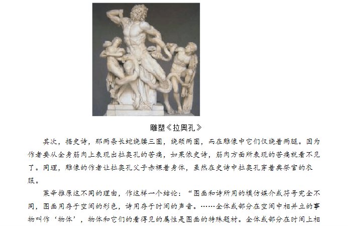 4.【答案】①材料一,按照首先提出莱辛的观点诗画并不同质,接着叙述“特洛伊木马”的故事,引出诗画异质说的背景,然后探讨诗画并不同质的原因,最后补充说明诗画虽不同质但可以互补。