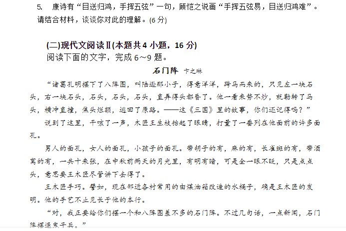 【解析】本题考查学生理解概括和运用的能力。考生要在充分理解文本观点的前提下,结合题干中“手挥五弦”“目送归鸿”的特点进行答题。答题时既要明确概括、引用材料中关于诗画异质的观点,也要结合顾恺之言论中两种画面的特质进行分析说明。