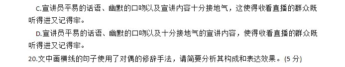 19.D【解析】首先看句式,句式结构要一致,平易的话语,幽默的口吻,十分接地气的宣讲内容句式是一致的偏正结构。其次看选词, “导致”后面往往跟的是不好的内容,坏的结果,所以选“使得”。