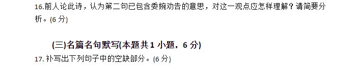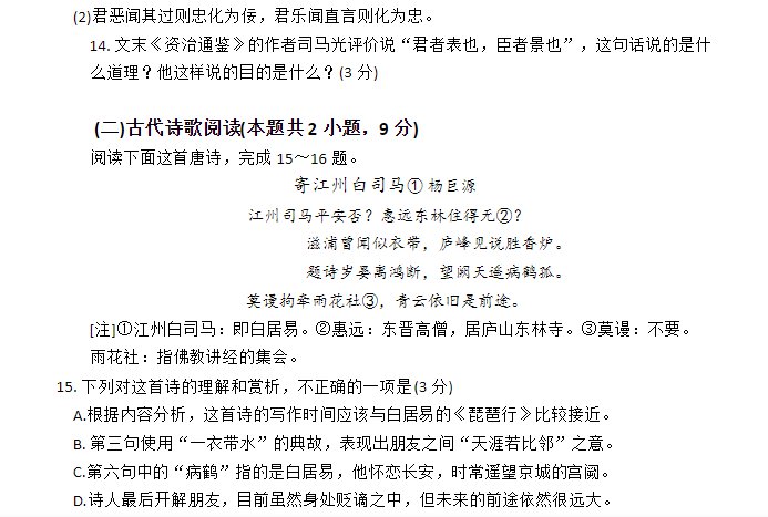 15.B【解析】本题综合考查学生对诗句内容、技巧以及情感的把握的能力,同时考查了考生对教材内容的延伸拓展的能力。B项,第三句是说诗人曾经听说湓水萦绕像衣带,是对此地景物的描绘,并未有表现朋友间“天涯若比邻”之意,此项对用典解释有误。