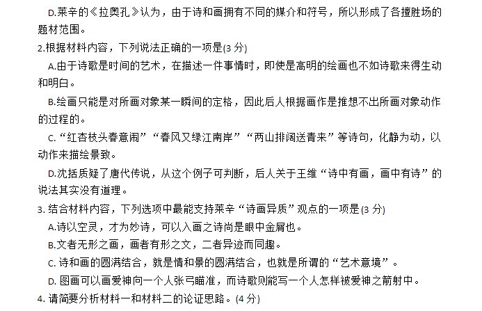 3.D【解析】本题考查学生概括观点、推理判断的能力。解答此类题目,应把握文章的观点再进行判断。本文观点“诗画异质”就是诗画并不同质,绘画宜于表现“物体”或形态,而诗歌宜于表现“动作”或情事。画仅能表现时间上的某一点,而动作却是一条绵延的直线。