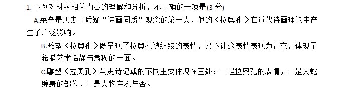B项错误,从第四段“据史诗,拉奥孔在被捆时放声号叫;在雕像中他的面孔只表现一种轻微的叹息,具有希腊艺术所特有的恬静与肃穆。”“希腊人在诗中并不怕表现苦痛,而在造型艺术中却永远避免痛感所产生的面孔筋肉挛曲的丑状”中可见,雕塑《拉奥孔》没有呈现拉奥孔被缠绞的表情,只表现一种轻微的叹息。
