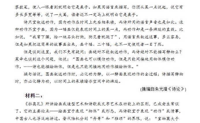 5.【答案】①材料中阐述了“诗画异质”的观点:绘画只宜于描写静物,因为一幅画仅能表现时间上的某一点,不可能超过一刹那内的物态和景象;而动作在时间上先后相承续,是一条绵延的直线,因此动作不宜于画。