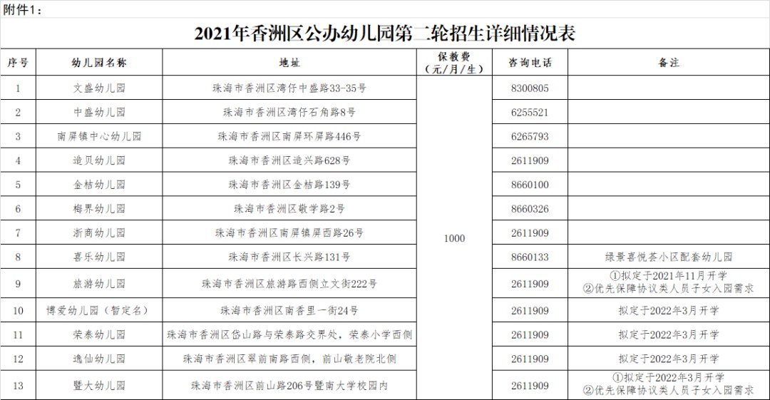 2021珠海香洲区公办幼儿园第二轮招生幼儿园详细情况